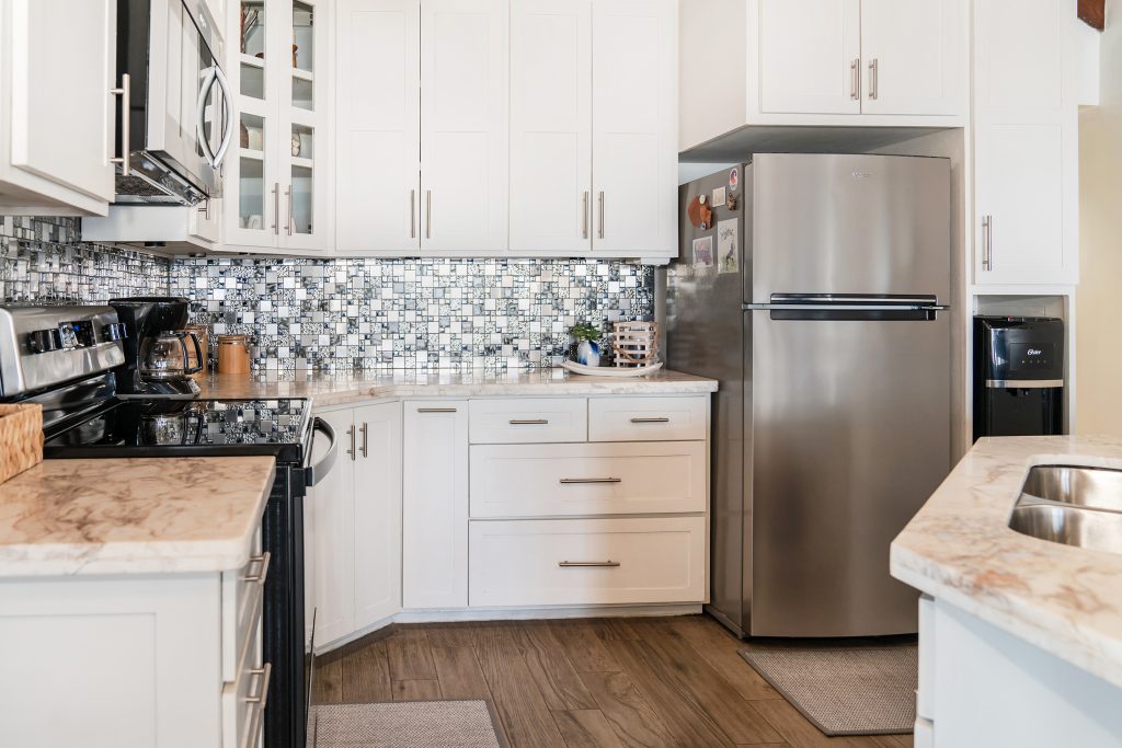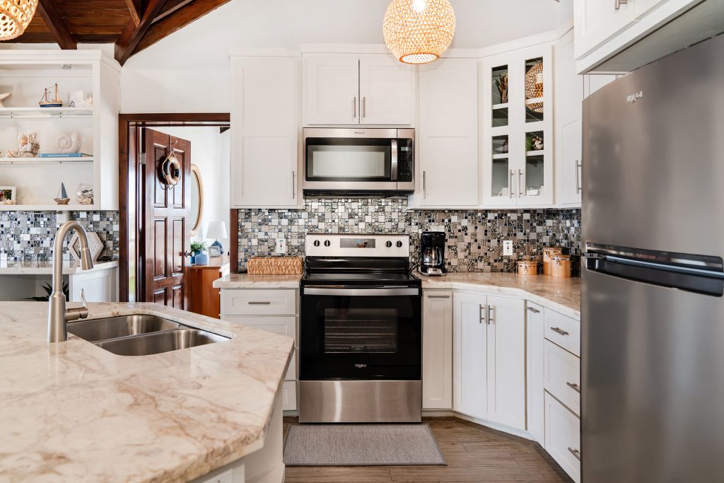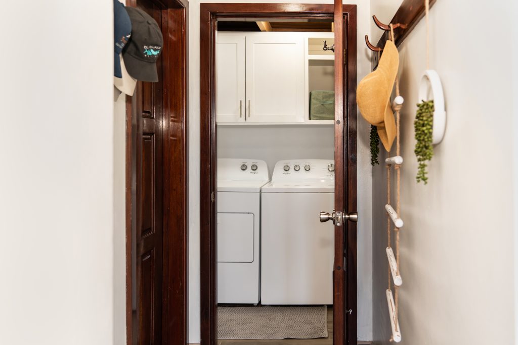 Interior Features: Fully furnished interior and exterior, A/C units, full-size kitchen with granite countertops and stainless appliances (refrigerator, stove/oven, microwave, dishwasher), full laundry room with washer/dryer, plank wood-look tile flooring, and a walk-in closet in the master.